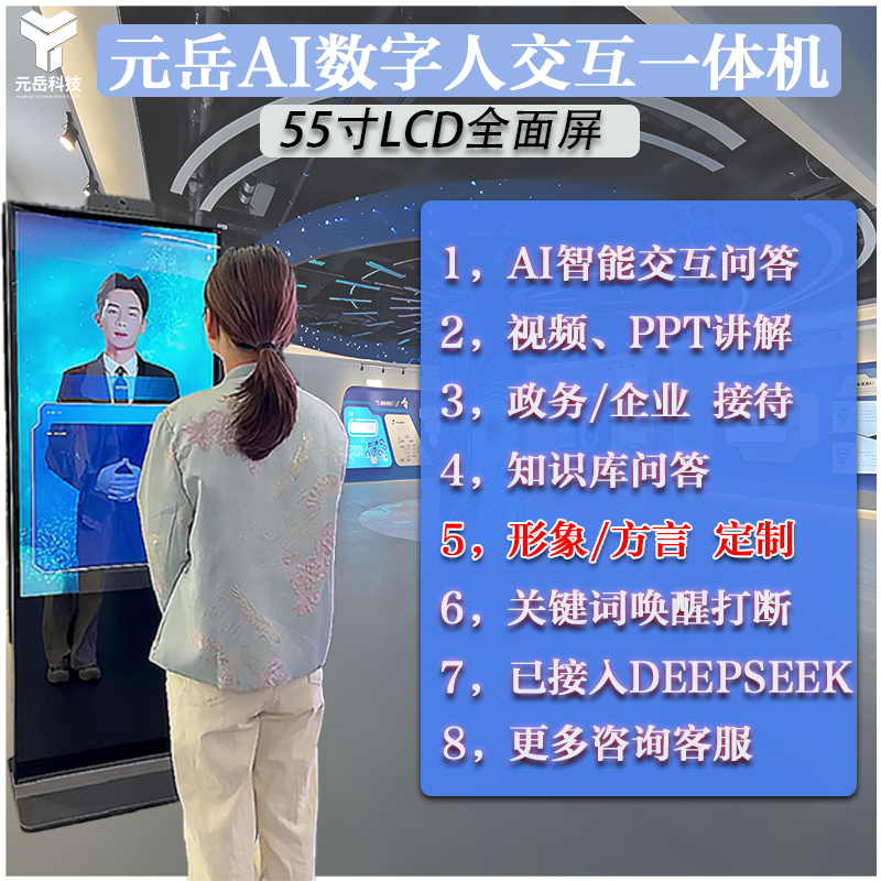 55寸AI数字人交互一体机 触屏 智能问答政务展厅讲解接待DeepSeek定制-山东元岳信息科技有限公司发布日期:2025-6-21